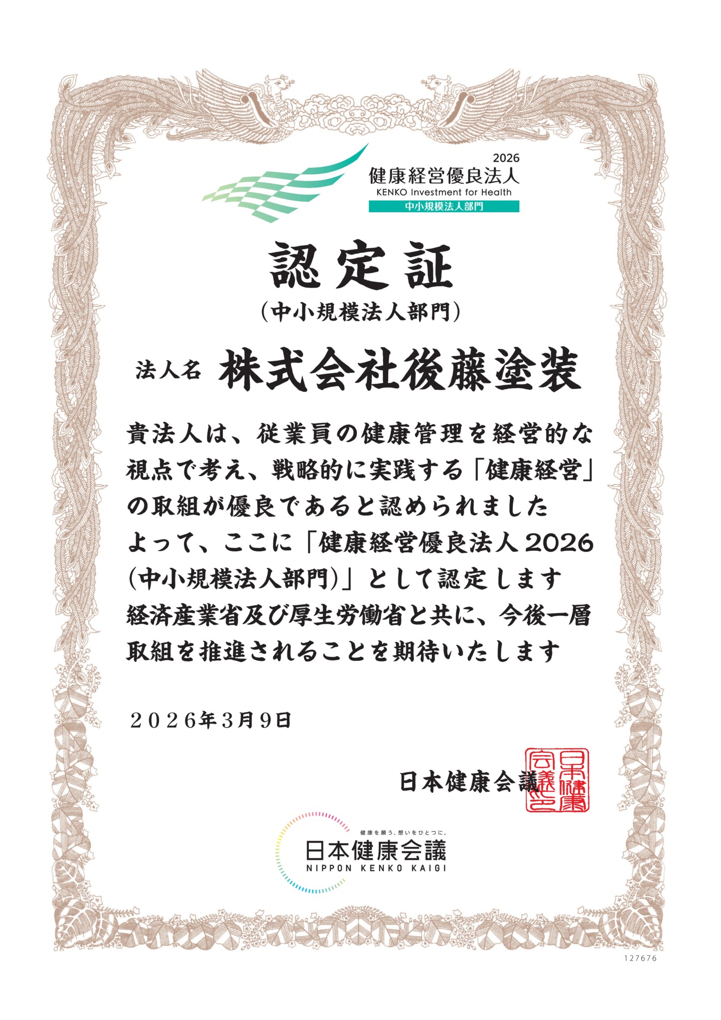 健康経営優良法人に継続認定されました 投稿公開日:2026年3月9日 投稿カテゴリー:お知らせ 今年も健康経営優良法人に継続認定されました。今回で3年目になります。 今後も従業員の健康を大切にし、従業員に優しい経営を心掛けていきます。 おすすめ 表彰を受けました 2023年5月10日 岐阜新聞の朝刊に広告が掲載されました 2024年8月26日 令和7年度 安全大会を開催しました 2025年7月11日